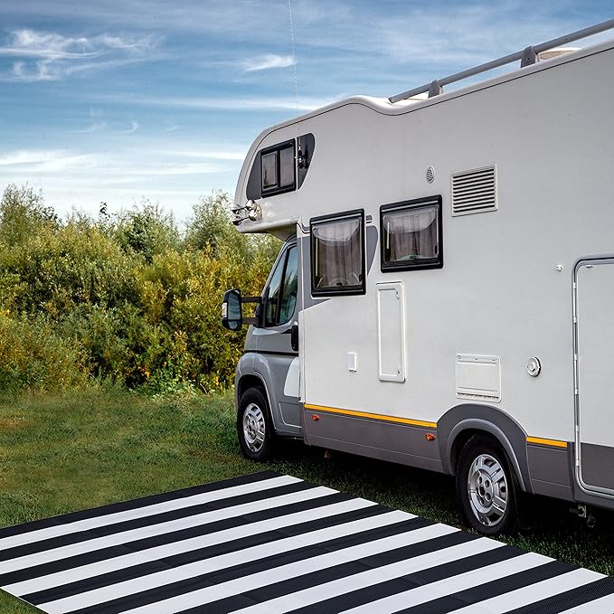 - Foldable camping rug - 100% recycled plastic tubes are tightly woven to create a sturdy portable rug and is compact for easy storage in your RV and campers.Comes with a portable carry bag.