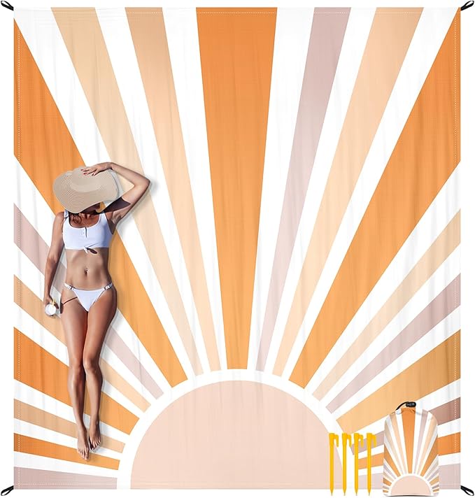- Bohemian Orange Sun Design: Boho orange sun burst beach blanket, featuring a stunning boho minimalist design with a geometric abstract sunset print. Embrace the beauty of the sun with this vibrant and eye-catching beach blanket, perfect for adding a touch of bohemian style to your beach outings.