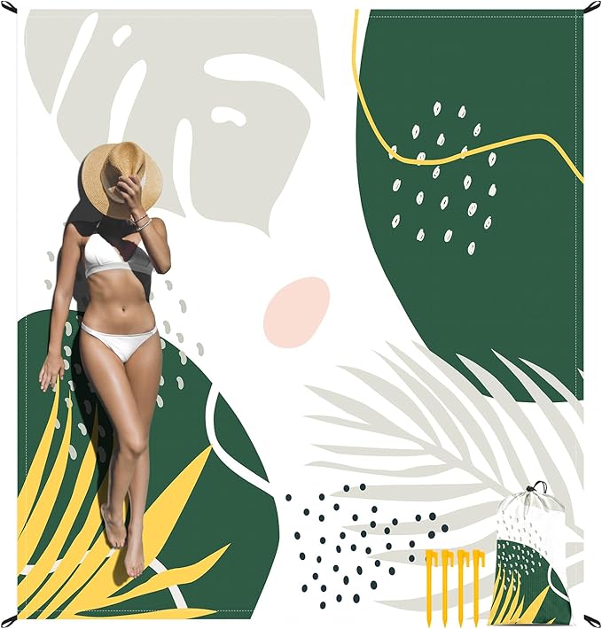- Welcome Windy Days - Our minimalist leaves waterproof sand-free beach mat will change the way you enjoy the beach. 4 stakes help you keep the large beach blanket firmly in the ground, so it doesn’t fly around and keep the sand off your food when windy. Enjoy a large sand free beach mat for total fun and leisure