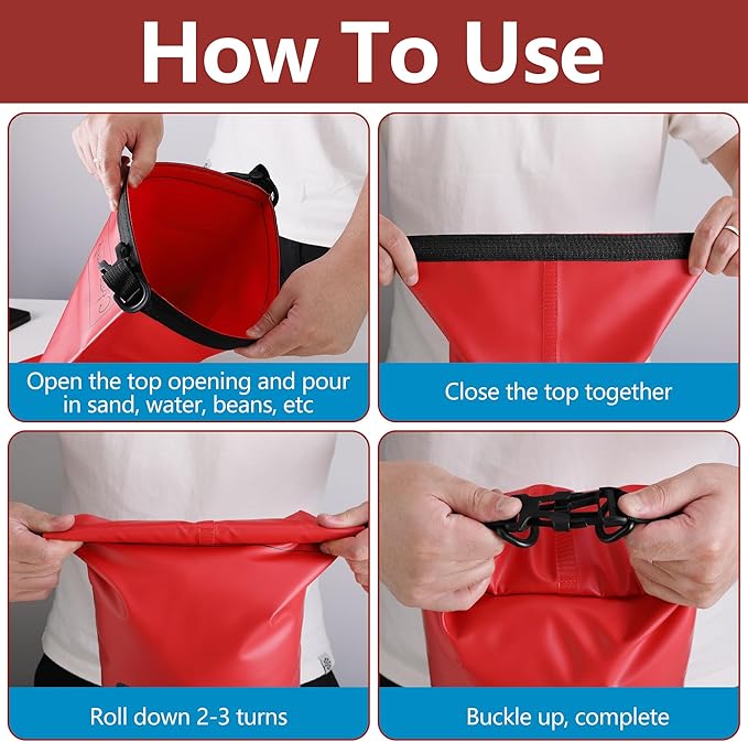 - Easy to use:Simple installation steps: fill with rocks or sand and grab the top braid, rolling down tightly 3 to 5 times, then buckle to seal!Even when you don't need it, it can also be folded to a very small size for easy storage and portability.