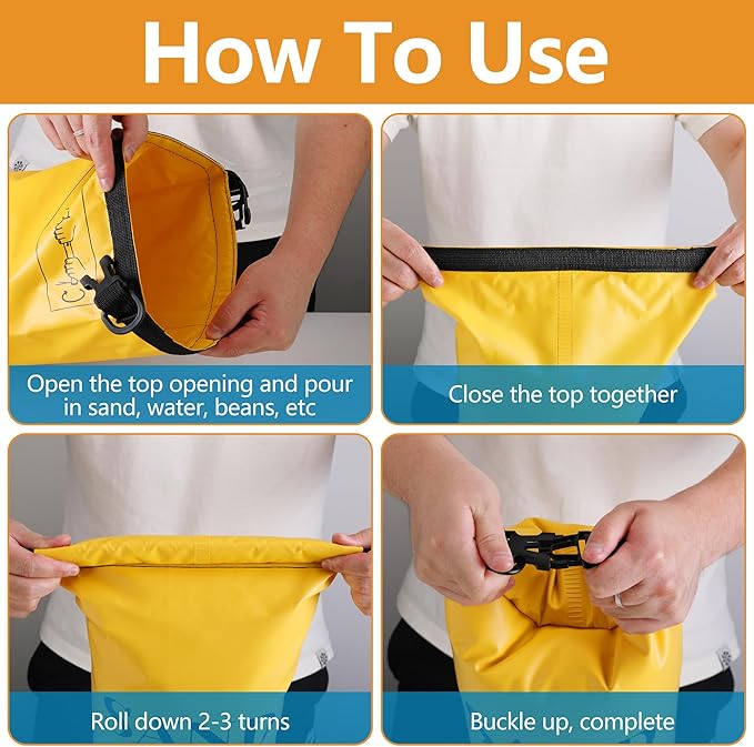 - Easy to use:Simple installation steps: fill with rocks or sand and grab the top braid, rolling down tightly 3 to 5 times, then buckle to seal!Even when you don't need it, it can also be folded to a very small size for easy storage and portability.