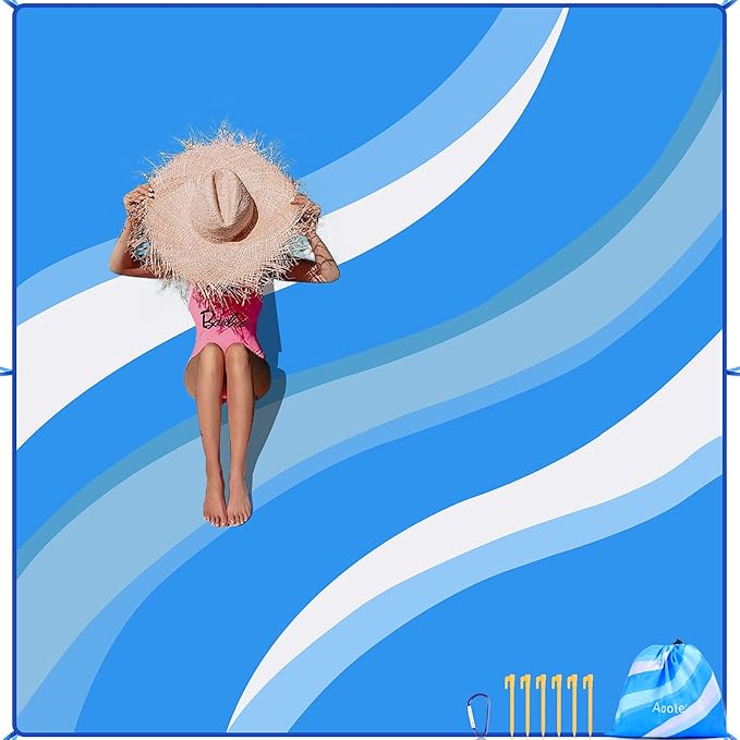 - DOUBLE FIXED AND PATTERN DESIGN: Our beach blanket features an original pattern design that requires no complicated assembly. The blanket has four corner pockets for storage or sand anchoring, six fixing bands, and six ground stakes. If it’s a windy day, use the stakes provided to secure the blanket to the sand for added safety and stability. The beach blanket is waterproof, sand-proof, and secure.
