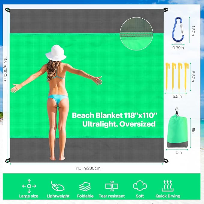 - LARGE SIZE DESIGN: The extra large beach mat is specially designed for family travel, providing enough space to lie down, rest and relax. Beach mat waterproof set includes 1 beach blanket, 4 stakes, 1 carabiner. Beach blanket measures 79" x 83", sleeps up to 7 adults, and weighs 12 oz.