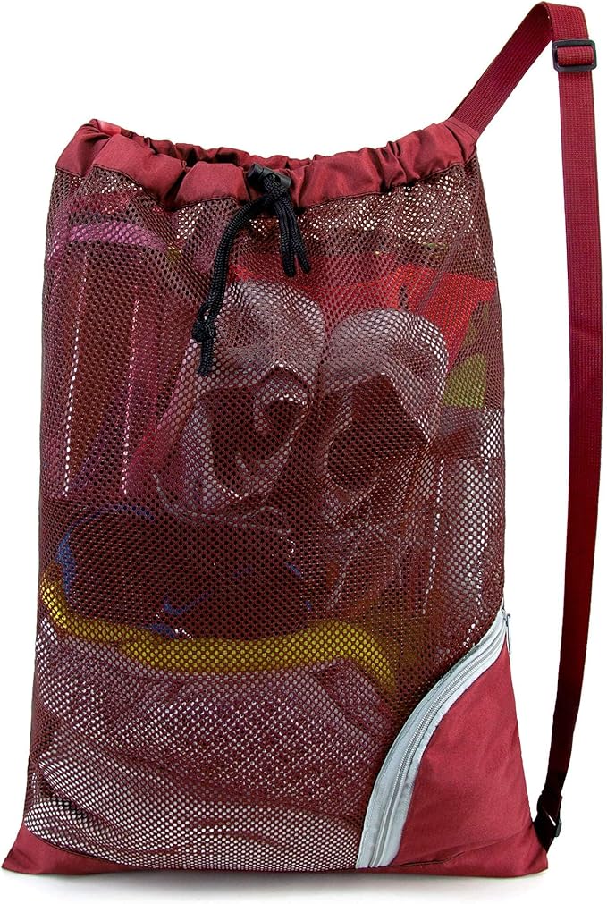 - FOLDABLE ZIPPER POCKECT & EASY TO CARRY: Extra zipper pockets of our mesh drawstring backpack make it easy for you to pack phones, keys. Besides,you can easily fold our mesh beach bag into the zipper front bag, which takes up hardly any space that can easily fit in a purse, pocket.You will always have a mesh swim bag with you whether you go to gym or beach trip.Our mesh drawstring bag is perfect for gym bag,swim bag,basketball bag,soccer bag,sports bag,beach gear bag.
