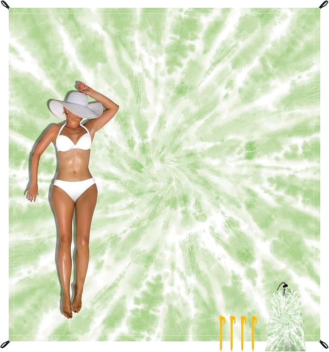 Green Tie-Dye Beach Blanket Sandproof, Large 78"×86" Beach Mat Sand Free Waterproof Fits Up to 4 Adult, Compact Quick Dry Polyester Outdoor Picnic Blanket with Stakes for Travel, Camping, Hiking