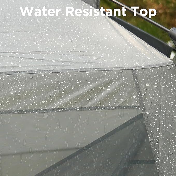 - BUILT FOR STABILITY: With sturdy iron poles and fiberglass support for the top, this screen house room is designed for durability and strength. It also comes with wind ropes and ground stakes to ensure stability even in windy conditions. The 150D Oxford fabric, combined with double-stitching, guarantees tear resistance and long-lasting performance.