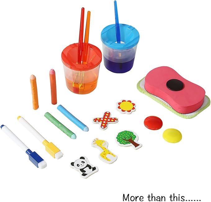 - Art & Craft Kit: For kids to unleash their imagination, this kit includes animal magnets, 6 color chalks, 8 whiteboard pens, a paintbrush, and letter and number magnets. Promotes active, screen-free play, perfect for any playroom or classroom.