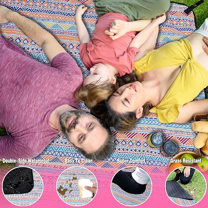 - ✅【Durable 3-Layer Design】Constructed with 3 layers, sturdy & skin-friendly polyester on top, soft padding in the middle and waterproof Oxford on backing. Thicker design along with 4 corner pockets (can be filled with sand or rocks) will keep our picnic mat grounded against wind, which also offers you extra sitting comfort, unlike other thin beach blankets.
