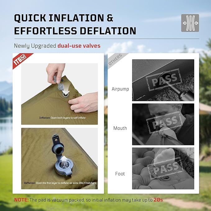 - Easy to Inflate and Deflate: Featuring a dual valve system and highly resilient foam, just open both valves for quick self-inflation and deflation—no need to use your mouth, hands, or a pump. When packing up, roll it with the elastic bands and store it in the included bag for easy transport, making it ideal for backpacking or car camping. 𝑵𝒐𝒕𝒆: 𝑫𝒖𝒆 𝒕𝒐 𝒗𝒂𝒄𝒖𝒖𝒎 𝒑𝒂𝒄𝒌𝒂𝒈𝒊𝒏𝒈, 𝒖𝒔𝒆 𝒚𝒐𝒖𝒓 𝒎𝒐𝒖𝒕𝒉 𝒐𝒓 𝒂 𝒑𝒖𝒎𝒑 𝒕𝒐 𝒊𝒏𝒇𝒍𝒂𝒕𝒆 𝒕𝒉𝒆 𝒔𝒑𝒐𝒏𝒈𝒆 𝒇𝒐𝒓 𝒕𝒉𝒆 𝒇𝒊𝒓𝒔𝒕 𝒕𝒊𝒎𝒆