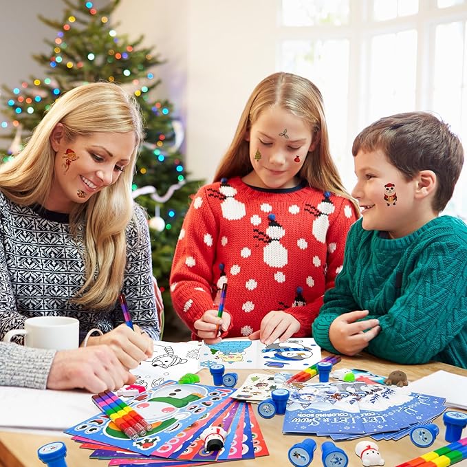 - Christmas Party Favors Set: our Christmas school DIY set includes 24 coloring books(12 pages per book), 24 rainbow stacking crayons(8 colors),24 tattoos, 24 stampers, 24 DIY Art Craft stickers, 24 Christmas pattern squishy pinch gift, sufficient quantity, and various styles enrich your school Christmas party