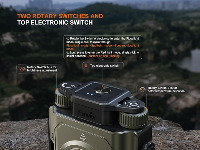 - VERSATILE MODES AND TEMPERATURE - A rotary toggle and an electronic switch grant easy access to eight white light modes and two red light modes. Another rotary toggle can adjust the color temperature of the floodlight.