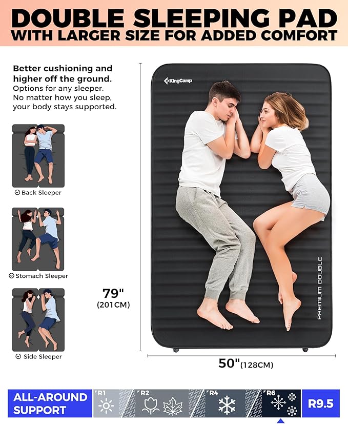 - PERFECT FOR TWO PEOPLE: QUEEN SIZE FOR DOUBLE COMFORT: This Queen-sized double sleeping pad is ideal for couples or two-person camping trips. It provides plenty of space and comfort, allowing both sleepers to rest peacefully without feeling cramped. With generous dimensions, it ensures compact storage when not in use. Whether you’re camping in a tent, car, or truck, this sleeping pad guarantees a comfortable and restful night outdoors.