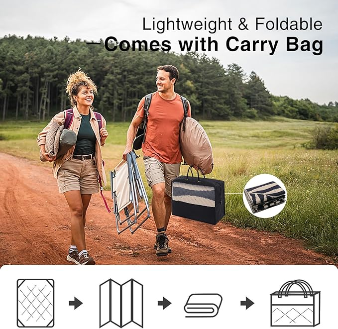 - Portable & Convenient: Lightweight and foldable, our waterproof rugs are easy to transport and store, making them ideal for travel and camping. They even come with a matching carry case for effortless portability.