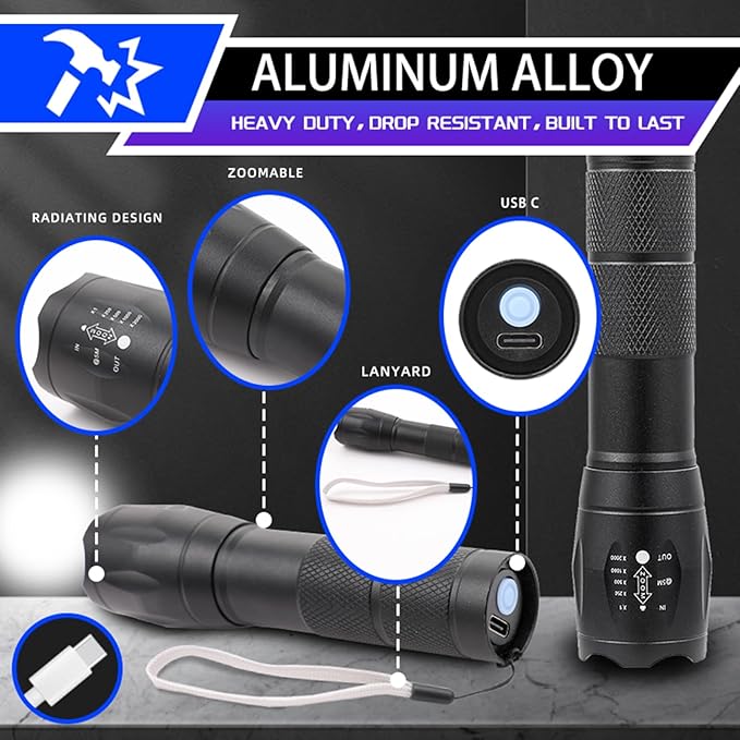 - USB-C Rechargeable Flashlights: LED flashlights contain a high-capacity rechargeable battery, for your long-time indoor and outdoor use, just a type-c cable can achieve fast charging.