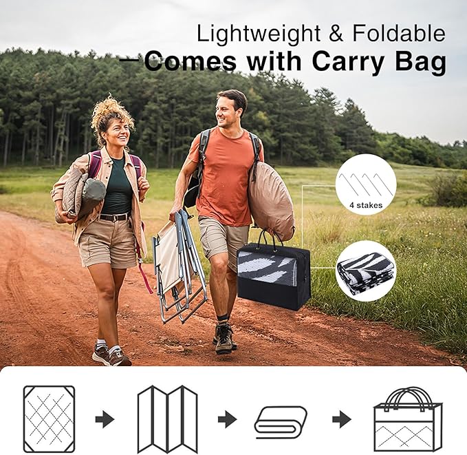 - Portable & Convenient: Lightweight and foldable, our waterproof rugs are easy to transport and store, making them ideal for travel and camping. They even come with a matching carry case for effortless portability.