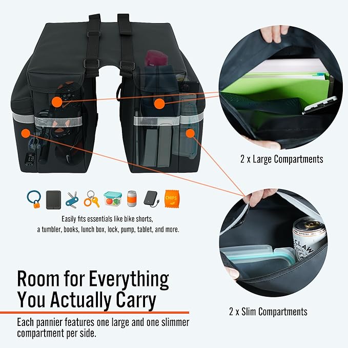 - Large zippered pockets - Panniers with large zippered pockets, reflective trim, and carrier handle on top.