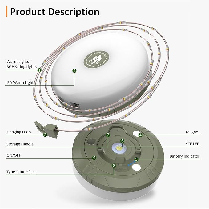 - Magnetic Base & Versatile Application — Three magnets on the base for you to stick this led camping latern to a metal surface, like a bike, car or a tent pole. Our camping string lights outdoor are not only suitable for camping, hiking, hunting, fishing and other outdoor activities, but also can be used for home decoration, hanging in the bedroom, backyard, camping tent, garden, RV, canopy, etc.