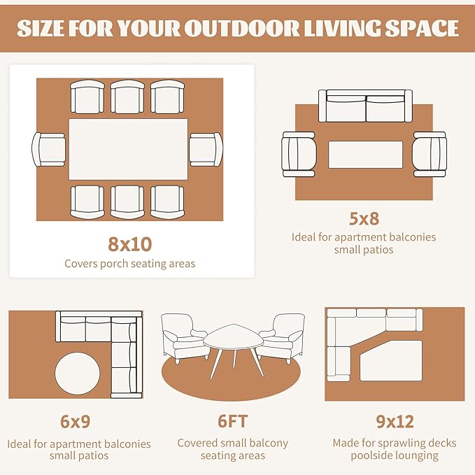 - Waterproof & Easy Cleaning: The outdoor/indoor rugs are water proof and easy to clean. Our rugs resist lots of stains: milk, wine, cola, grass and more. Simply sweep away dirt with water and the breathable design make it possible to airing dry in few minutes. If you are outside without water, you can just wipe it with cleaning cloth or shake it, rid the dust off. Great for keeping dogs out of the dirt.