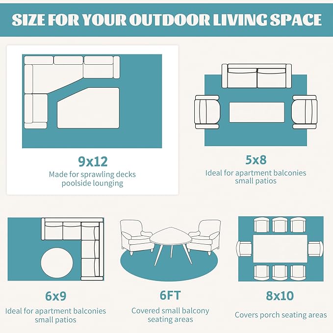 - Waterproof & Easy Cleaning: The outdoor/indoor rugs are water proof and easy to clean. Our rugs resist lots of stains: milk, wine, cola, grass and more. Simply sweep away dirt with water and the breathable design make it possible to airing dry in few minutes. If you are outside without water, you can just wipe it with cleaning cloth or shake it, rid the dust off. Great for keeping dogs out of the dirt.