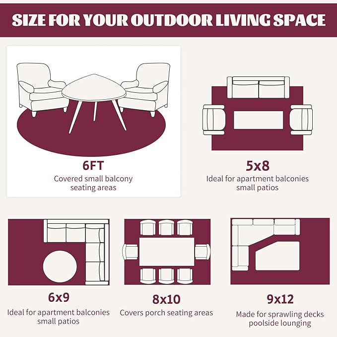 - Waterproof & Easy Cleaning: The outdoor/indoor rugs are water proof and easy to clean. Our rugs resist lots of stains: milk, wine, cola, grass and more. Simply sweep away dirt with water and the breathable design make it possible to airing dry in few minutes. If you are outside without water, you can just wipe it with cleaning cloth or shake it, rid the dust off. Great for keeping dogs out of the dirt.