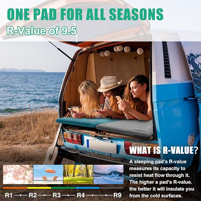 - ใ๐๐ง๐ ๐๐๐ ๐๐จ๐ซ ๐๐ฅ๐ฅ ๐๐๐๐ฌ๐จ๐ง๐ฌใ: With a R-value of 9.5, our sleeping pad for camping offers superior insulation, moisture resistance and breathability to withstand harsh external environments, you can enjoy a comfortable sleep year-round when traveling. Camping sleeping pad measures 26.37"x 76" x 3.14"after inflation, and folds down to 26.37" x 9", weighs 5.95 lbs, it comes with built-in pillow for head support. Prefect for tent camping, SUV trips, car traveling or as a guest bed.