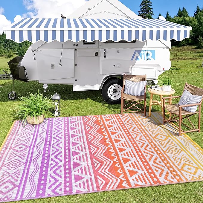 - REVERSIBLE AND VERSATILE: This plastic outdoor rug features universal colors and a reversible design, making it easy to refresh your outdoor space with just a quick flip. Suitable for use in any space or occasion, such as balcony, patio, porch, backyard, deck, beach, picnic, RV camping, etc.