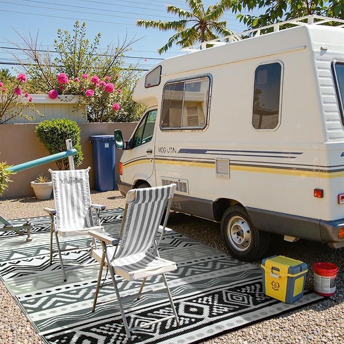 - REVERSIBLE AND VERSATILE: This plastic outdoor rug features universal colors and a reversible design, making it easy to refresh your outdoor space with just a quick flip. Suitable for use in any space or occasion, such as balcony, patio, porch, backyard, deck, beach, picnic, RV camping, etc.