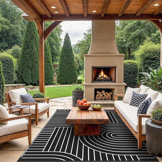 GENIMO Outdoor Rug 6'x9' Patio Waterproof, Lightweight Outdoor Plastic Straw Rug Clearance, Reversible Camping Mat Outdoor Carpet for RV, Picnic, Backyard, Deck, Balcony, Porch, Black & White