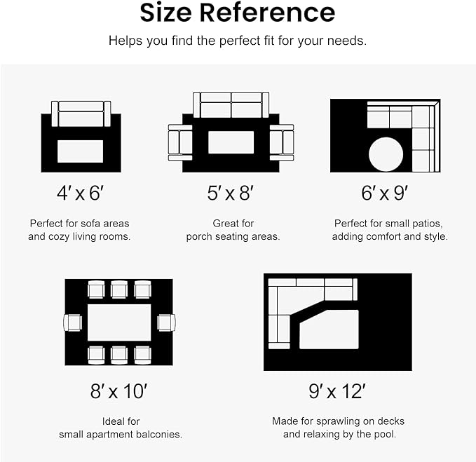- [Versatile & Functional] Our outdoor rugs 5x8 are soft, hard-wearing, and suitable for patios, decks, gardens, beaches, picnics, RV camping, garages, balcony, backyard, living rooms, indoor and outdoor use.