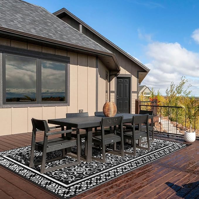 Outdoor Patio Plastic Straw Rug - 5'x8' Outdoor Camping Rug Waterproof Reversible, Area Carpet Patios Clearance RV, Outside Porch Balcony Deck for Camper, Classic Black & White