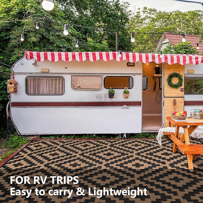 Outdoor Patio Plastic Straw Rug - 9'x12' Outdoor Camping Rug Waterproof Reversible, Area Carpet Patios Clearance RV, Outside Porch Balcony Deck for Camper, Black & Brown