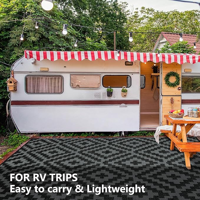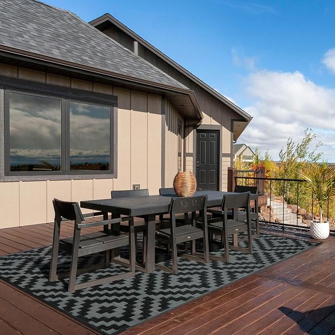 Outdoor Patio Plastic Straw Rug - 9'x18' Outdoor Camping Rug Waterproof Reversible, Area Carpet Patios Clearance RV, Outside Porch Balcony Deck for Camper, Black & Grey