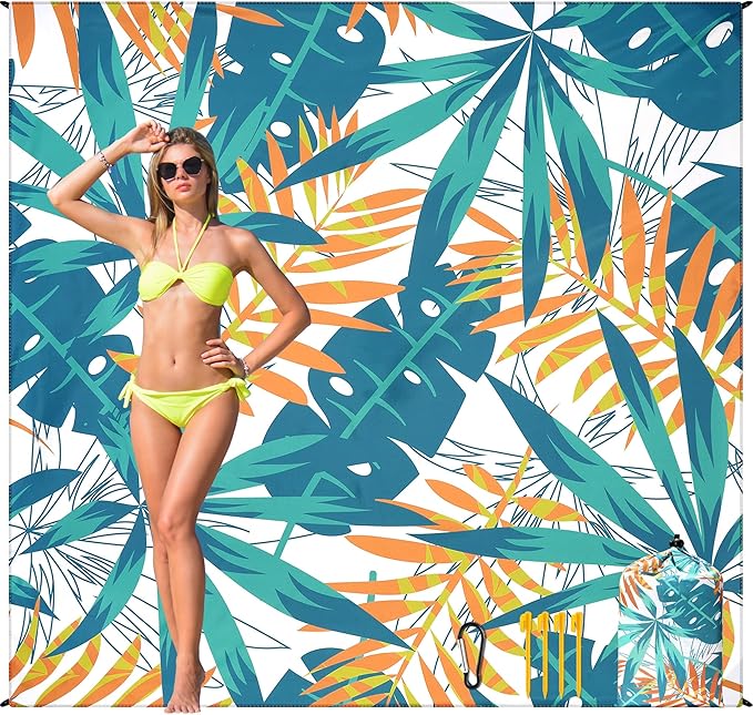 Beach Blanket Waterproof Sandproof Beach Mat 79โx 83โ for 1-4 Adults Quick Drying Durable Outdoor Picnic Mat for Beach Festival Travel Camping Hiking (W&GN&Y-Palm, 79"ร83"(4 Person))
