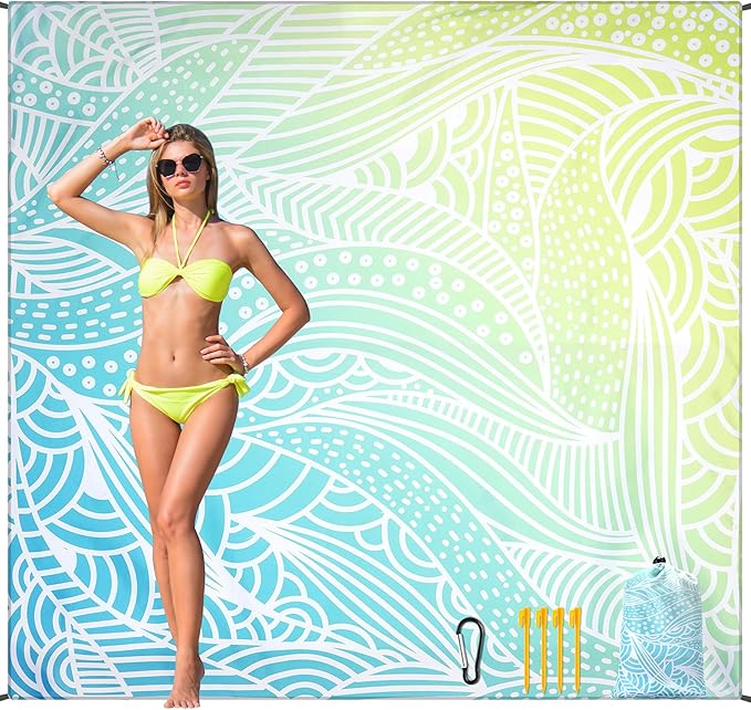 Beach Blanket Waterproof Sandproof Beach Mat 79โx 83โ for 1-4 Adults Quick Drying Durable Outdoor Picnic Mat for Beach Festival Travel Camping Hiking (Gradiant BL&GN-Ripple, 79"ร83"(4 Person))