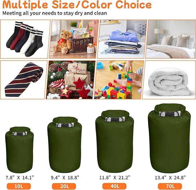 - 【Multiple Color/Size Choice】You can choose from orange, green, blue and purple. Any of the bright colors bringing you a bright mood and making your outing or storage room a beautiful scenery. We have waterproof dry sacks from small to large, ranging from 10L, 20L, 40L to 70L, meeting all your needs to stay dry and clean.