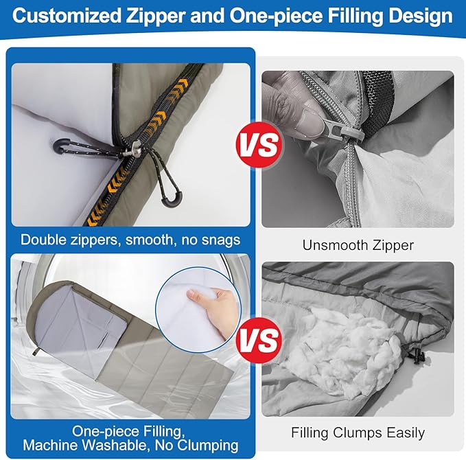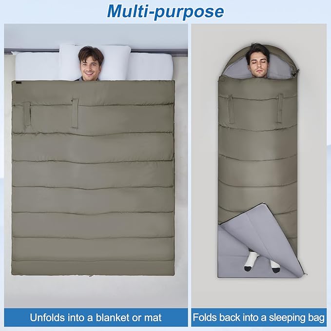- Hand-out Design Sleeping Bag: Our adult sleeping bags feature a unique hand-out design, allowing you to move your arms freely without removing the bag, equipped with a windproof flap to keep out the wind, keeping you warm and comfortable