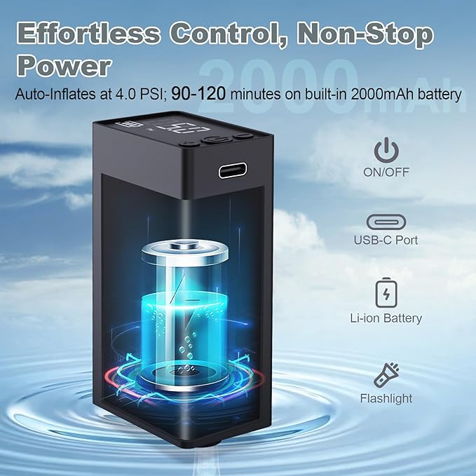 • Intelligent Shower Pump - Featuring the smart auto pressure control for easy, worry-free inflation; 2000mAh rechargeable battery lasts up to 120 mins; built-in flashlight stay prepared for night use or emergency situations. Note:No Foot Pump Included!
