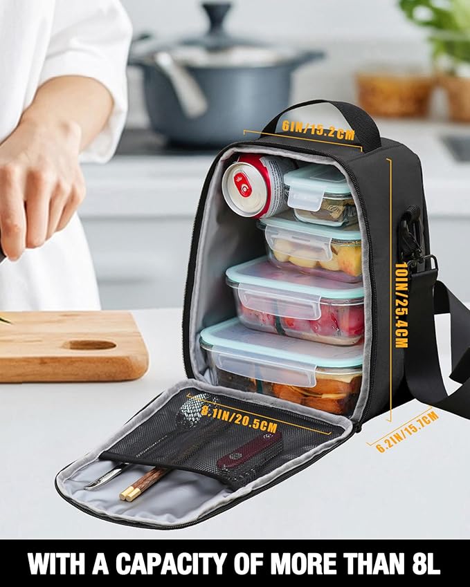 - Large Capacity & Smart Storage:With dimensions of 9 x 9 x 10.5 inches, the spacious main compartment fits three to four food storage containers. The front drawstring pocket accommodates most popular water bottle brands and sizes with handles or straight designs. Side mesh pockets and an interior net compartment keep utensils, keys, and essentials organized.