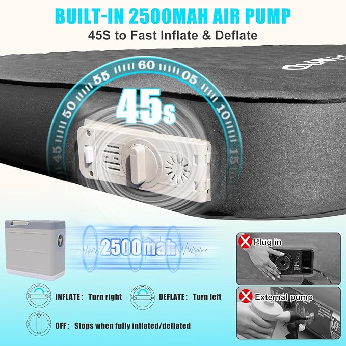 - ใ๐๐ฎ๐ฅ๐ญ๐ข-๐๐ฎ๐ง๐๐ญ๐ข๐จ๐ง๐๐ฅ ๐๐ง๐ญ๐๐ฅ๐ฅ๐ข๐ ๐๐ง๐ญ ๐๐ข๐ซ ๐๐ฎ๐ฆ๐ฉใ-The built-in air pump contains 2*2500mAh high capacity battery, can fill the camping pad in 45S. Pump is rechargeable and detachable. A full charge 3.5 hours can inflate the pad about 7 cycles. The normal light of pump for campsite illumination and the SOS light feature for emergencies. it also has a hook to be attached to the tent. Pls don't run the pump continuously for over 5 mins. Let it cool down before the next use.