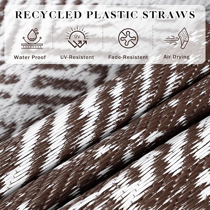- โ๏ธWEATHER RESISTANCE: Our brown outdoor mat 4x6ft is crafted from high-quality UV-resistant materials, effectively preventing fading from prolonged sun exposure. The deck rug also boasts excellent water resistance, keeping it safe from rain, while ensuring long-lasting outdoor use
