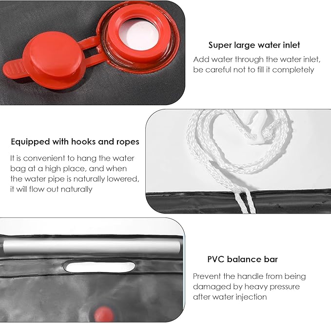 - EASY TO USE: The solar powered camping shower bag does not require electricity or gas, it only needs sunlight and absorbs the sun's heat to get hot water.