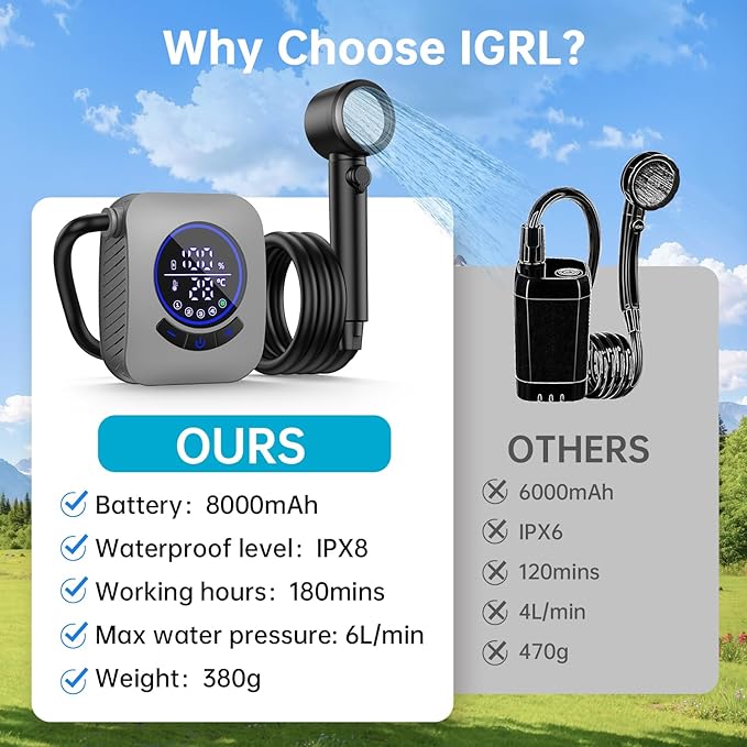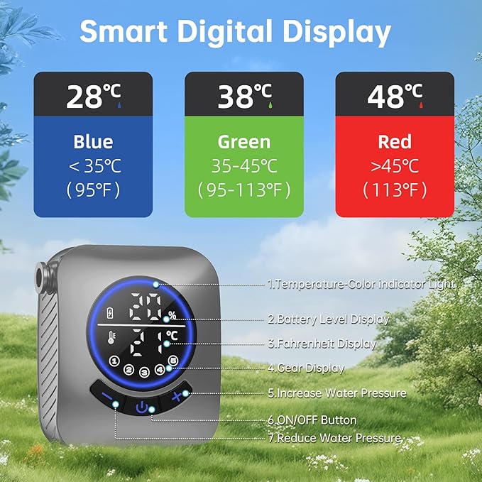 - 【Smart LED Display for Real-Time Monitoring】The LED screen provides real-time monitoring of both the battery level and water temperature, allowing you to keep track of both at a glance. This feature helps you avoid overheating and ensures you never run out of power unexpectedly, offering a safer and more convenient experience.