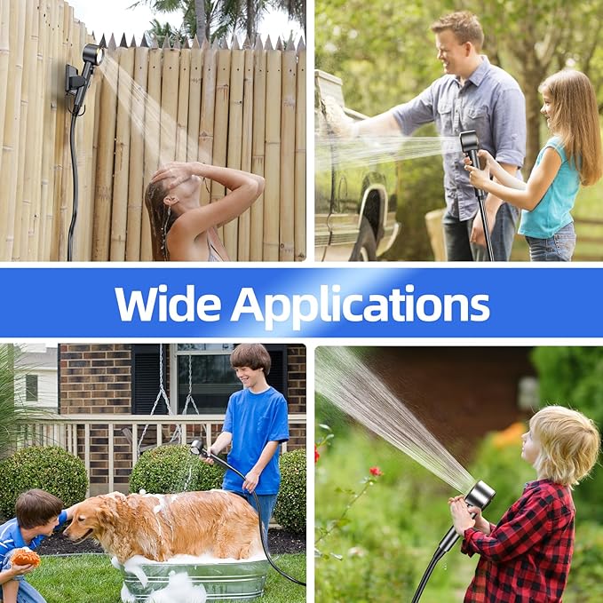 • Compact and Portable: Portable shower kit weights only 2.3LB, includes 1* Multi modes shower head, 1* Spray gun head, 1* Power water pump, 1* 6.7ft Water pipe, 1* Multi-use hook, 1* Type-C charging cable, and a Mesh organizer bag for convenient to carry and store. Ideal for indoor/outdoor showers, camping, BBQ, hiking, beach, trips, bathing, pet bath, car washing, plant watering and more indoor outdoor use
