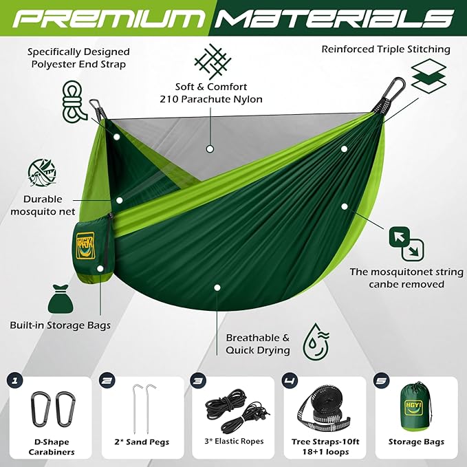 - Portable & Easy Setup Design:This hammock is Lightweight and portable (approx. 1000g) and comes with a compact carry bag and assembly accessories (e.g hooks, tree straps). No tools required! Quick and hassle-free setup makes it perfect for camping hammock for adults adventures like camping,hiking.Simply hang between two trees or stands, and your camping hammock with mosquito net is ready in minutes