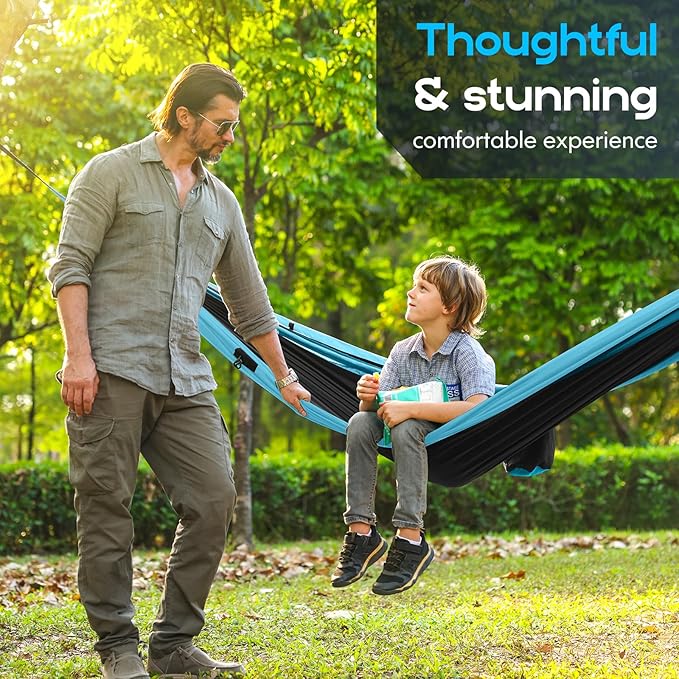 • High Weight Capacity & Durable Material (Nylon/Polyester):Crafted from high-density nylon or polyester fabric, this heavy duty hammock offers abrasion resistance, water resistance, and tear strength. With a weight capacity of up to 600 lbs, this hammocks for outside is ideal for family or multi-person use