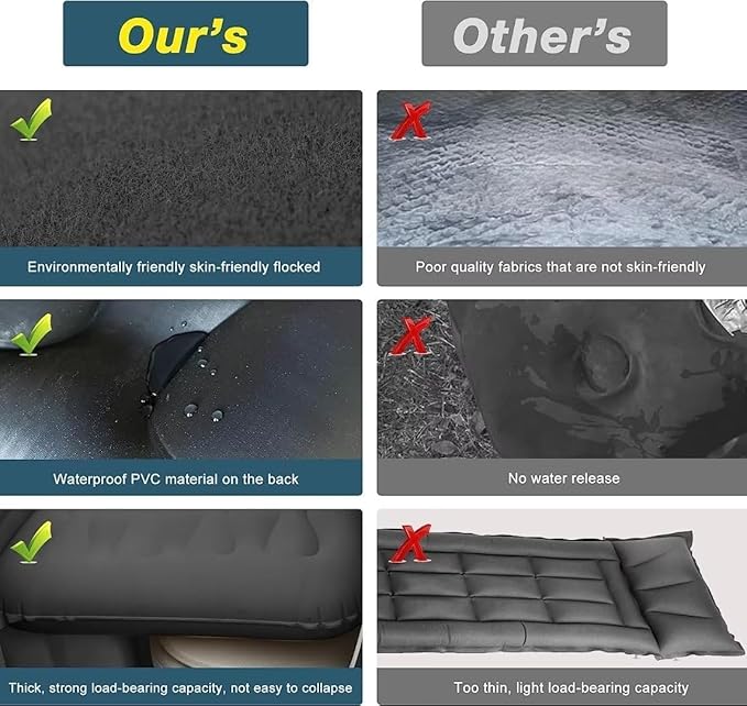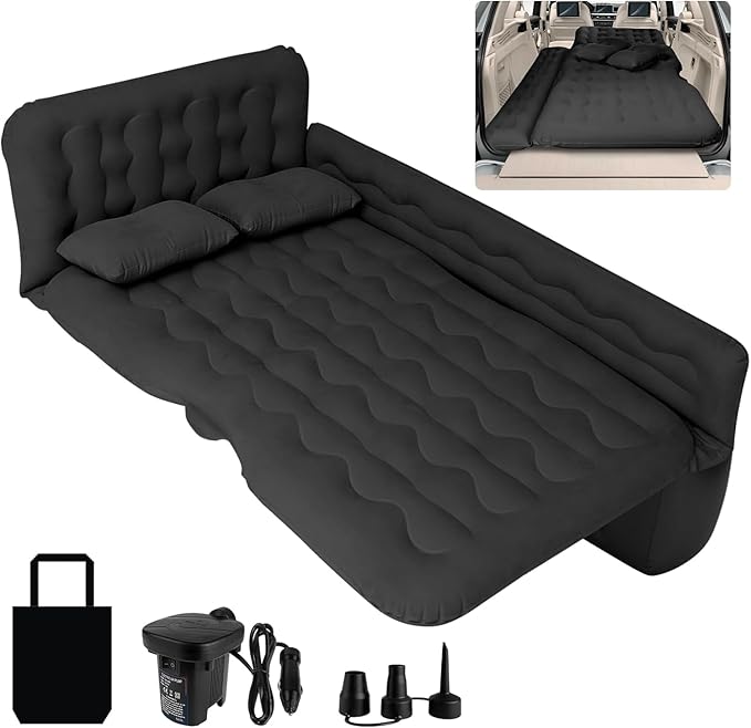 - 【All Products You Will Get】① Multifunctional air mattress ② Two inflatable pillows car inflatable bed ③ Car air pump ④ Instruction manual ⑤ Tote bag.Each product will undergo strict testing and quality control, so you can use the car air mattress camping bed with confidence.