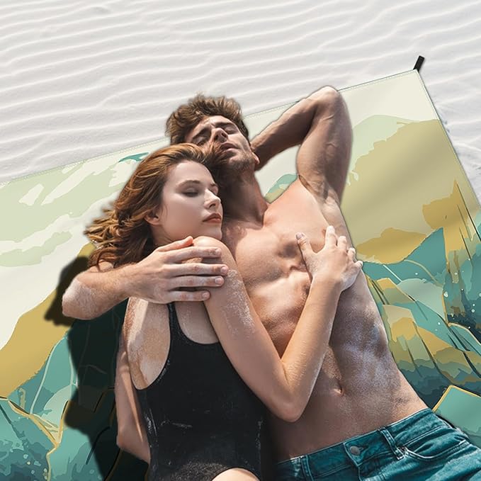 Beach Blanket Waterproof Sandproof Large Beach Mat 83" X 106" for 5-7 Adults Sand Free Mat Quick Drying,Oversized,Lightweight & Durable with 4 Stakes & 4 Corner Pockets for Beach Camping .(Mountain)