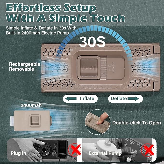- Free Your Hands, Quickly Inflate & Deflate: Our self inflating sleeping pad features a built-in intelligent air pump design. One click control for quick inflation and deflation. Camping mattress pad click to automatically inflate and deflate, saying goodbye to carrying extra air pumps or inflating the cushion with your mouth or feet. Self inflating camping pad spend less time setting up and more time enjoying nature