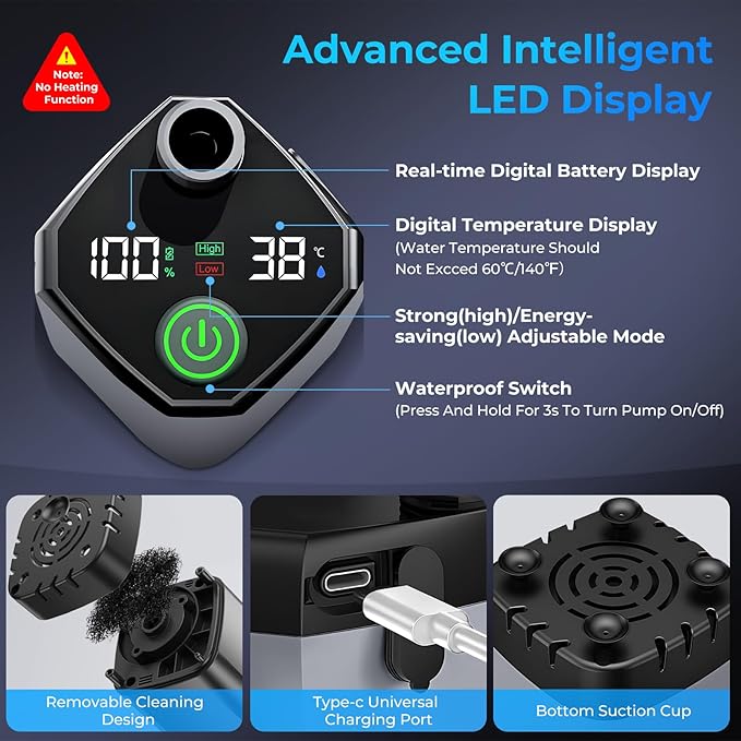 • 【Real Time Smart LED Display】 Our outdoor shower features an advanced LED display that provides a clearer indication of power status, water temperature and running devices. This portable shower can be switched between two modes: high power mode / low energy saving mode. The “high” mode lights up green and the “low” mode lights up red. The water temperature ranges from 32-140°F (0-60°C) Enjoy your outdoor adventures without worrying about the outdoor shower. Note: No Heating Function