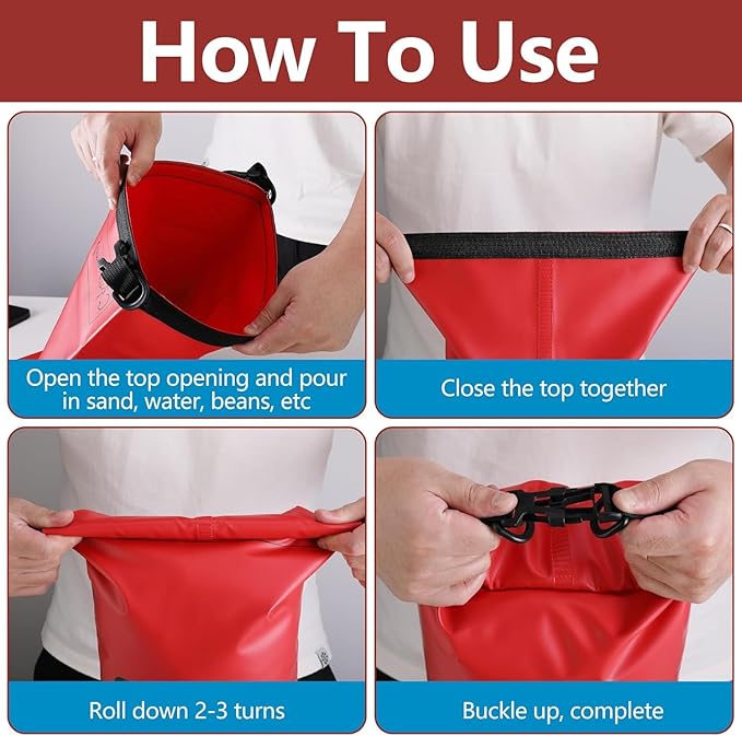 - Easy to Use: Filled with rocks or sand, grab the top braid, roll down tightly 3 to 5 times, and then buckle to seal. When not in use, it can be easily folded to a compact size for convenient storage and portability
